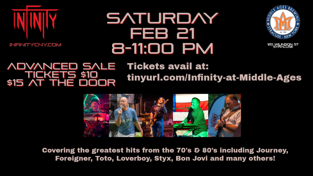 Get ready for a night of pure rock nostalgia as Infinity takes the stage — covering the greatest hits from the 70’s & 80’s, including Journey, Foreigner, Toto, Loverboy, Styx, Bon Jovi, and many others!