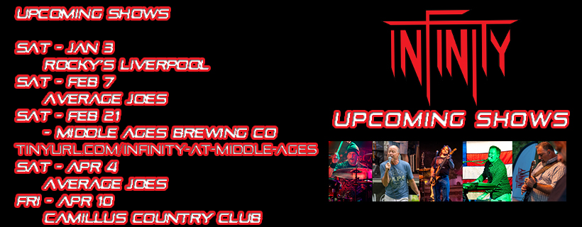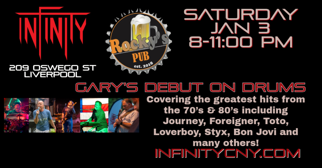 Infinity is excited to announce a big change in our lineup after 2025. Our drummer, who joined us last March, Dylan Smith, has co-founded two new bands focusing on 1990’s and 2000’s rock favorites: 48 Hours and Tell All Your Friends. Replacing Dylan on drums starting January 3rd at Rocky’s Pub will be Gary Sass, formerly with Fatal, Warning, Infra Red, and Prophecy, and currently with Eyes of Odin. See more details on our pages, and come out this Saturday the 6th at Average Joe’s to see Dylan’s last show with Infinity, with Gary sitting in on a few songs. Thank you to Dylan for seeing us through 2025, and let’s all welcome Gary to the Infinity family in the new year!