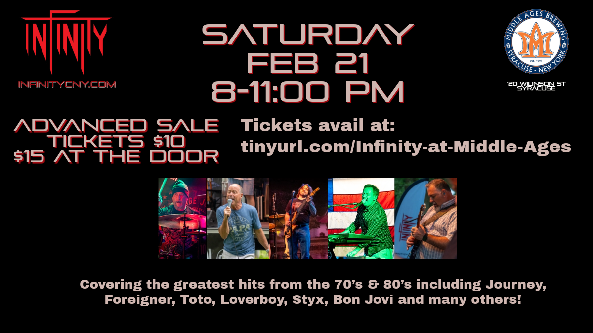 Grab a pint, bring your friends, and rock out with Infinity at Middle Ages Beer Hall! TICKETS AVAILABLE HERE