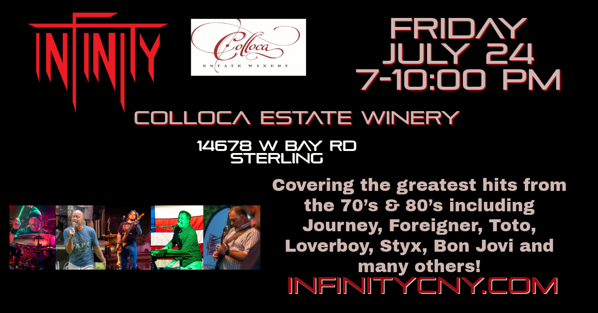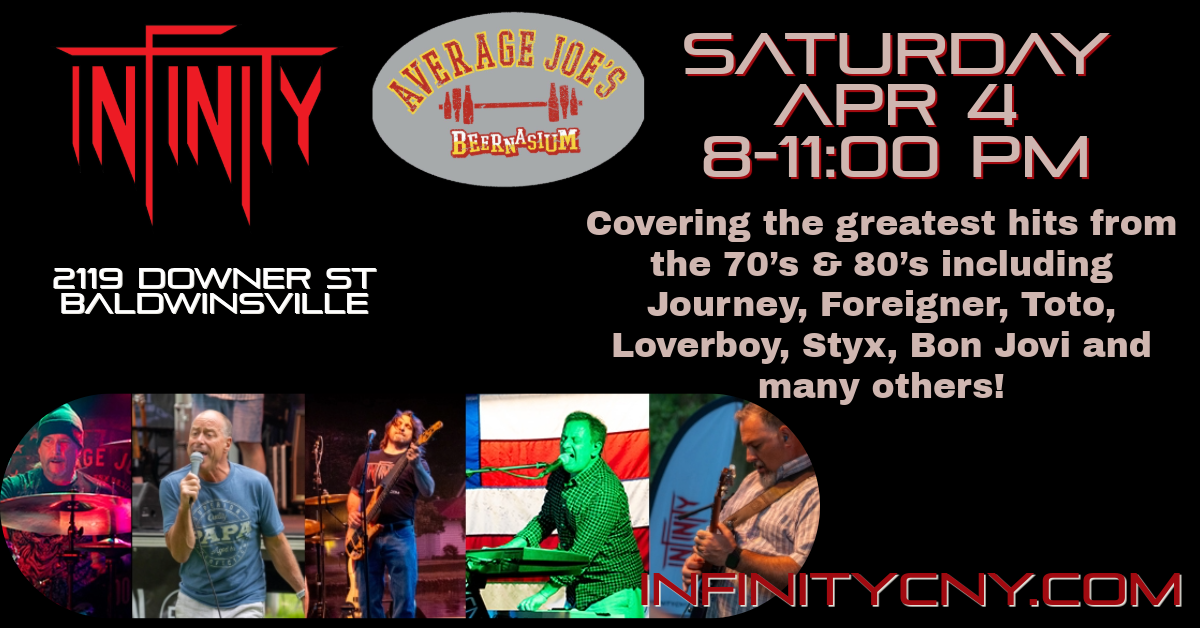 Get ready for a night of pure rock nostalgia as Infinity takes the stage — covering the greatest hits from the 70’s & 80’s, including Journey, Foreigner, Toto, Loverboy, Styx, Bon Jovi, and many others!